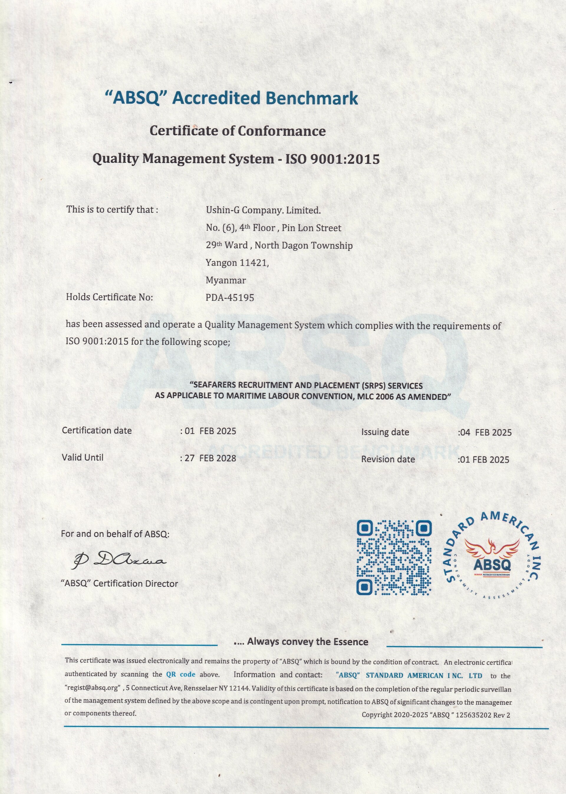 In 2018, USHIN-G was founded by Capt. Min San and Capt. Than Naing Win. We recruit, train and provide Loyal, competent and high-quality pool crew with high retention rates to our partner Ship Owners and Ship Managers. We give one stop service to provide sincere solution to our clients’ needs.